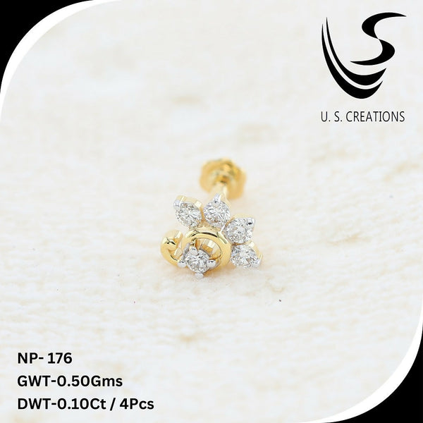 Elevate your elegance with this exquisite gold nose pin featuring a brilliant cluster of 4 natural diamonds. this intricately designed piece offers a secure screw-back closure for ultimate comfort and durability. A perfect blend of tradition and modern sophistication.