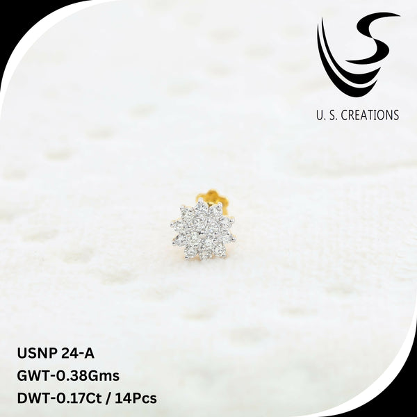 Adorn your nose with this elegant gold nose pin, featuring a mesmerizing cluster of Fourteen sparkling diamonds. this exquisite piece offers a secure screw-back closure for a comfortable fit, making it the perfect blend of luxury and everyday wear
