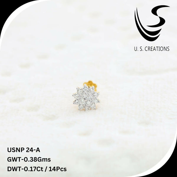 Elevate your elegance with this exquisite gold nose pin featuring a brilliant cluster of 14 natural diamonds. this intricately designed piece offers a secure screw-back closure for ultimate comfort and durability. A perfect blend of tradition and modern sophistication.