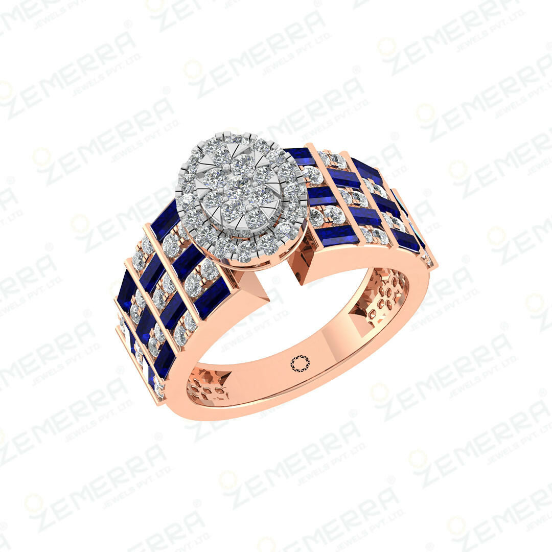 Unique 14K rose gold diamond ring with blue baguette stone by jewelry manufacturer India, crafted for elegant premium fine jewelry.