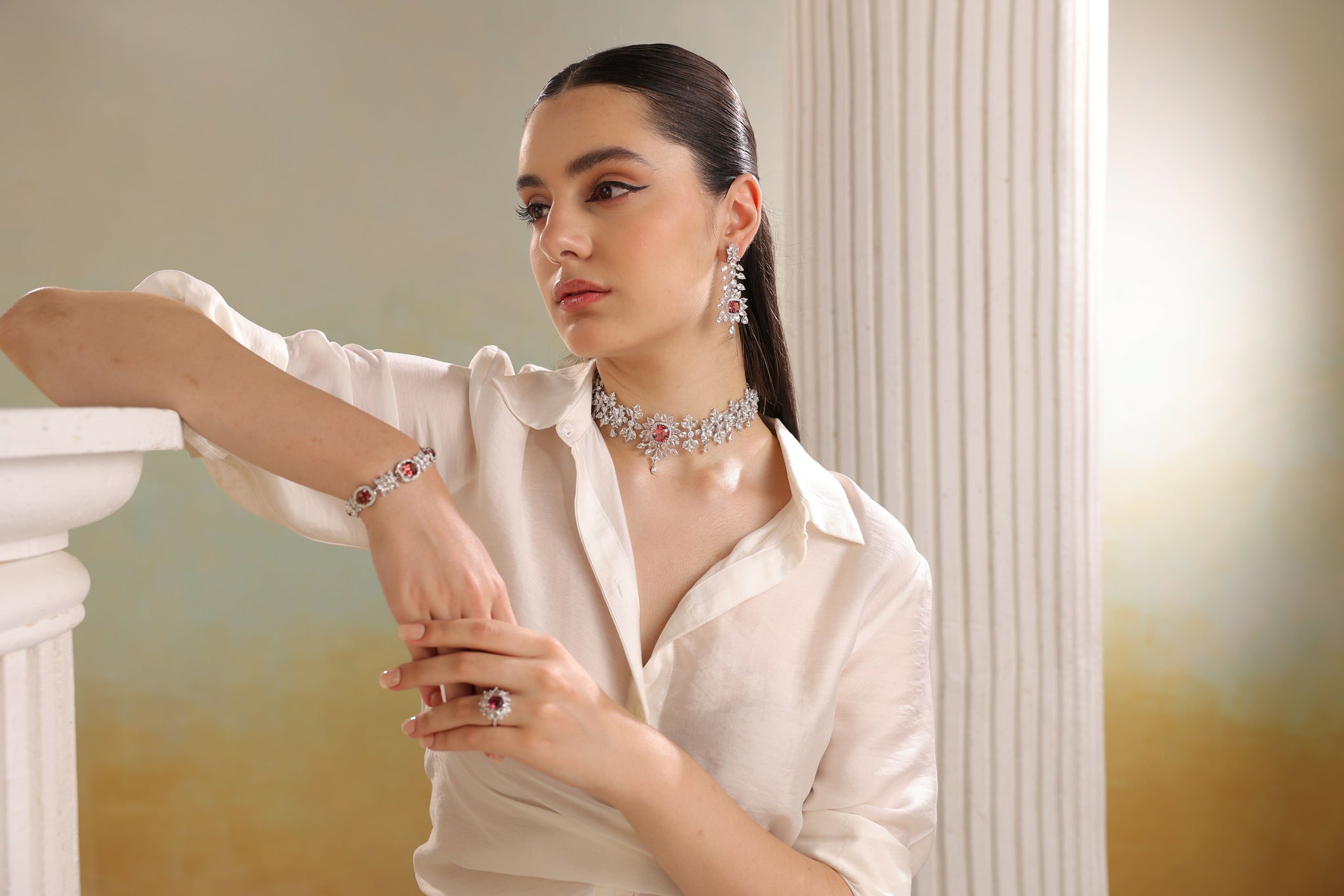 Luxury 14K gold diamond floral ring with ruby gemstone crafted by jewelry manufacturer India, offering refined and premium fine jewelry.
