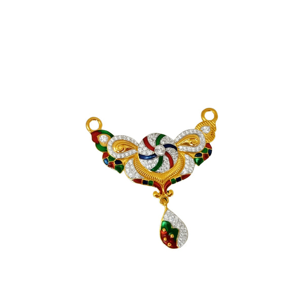 The MS Pendant (Code: 07) is a finely crafted gold pendant weighing approximately 7 grams. Designed to complement a mangalsutra chain or a plain gold chain, it blends classic Indian motifs with subtle modern touches for a versatile and stylish look.